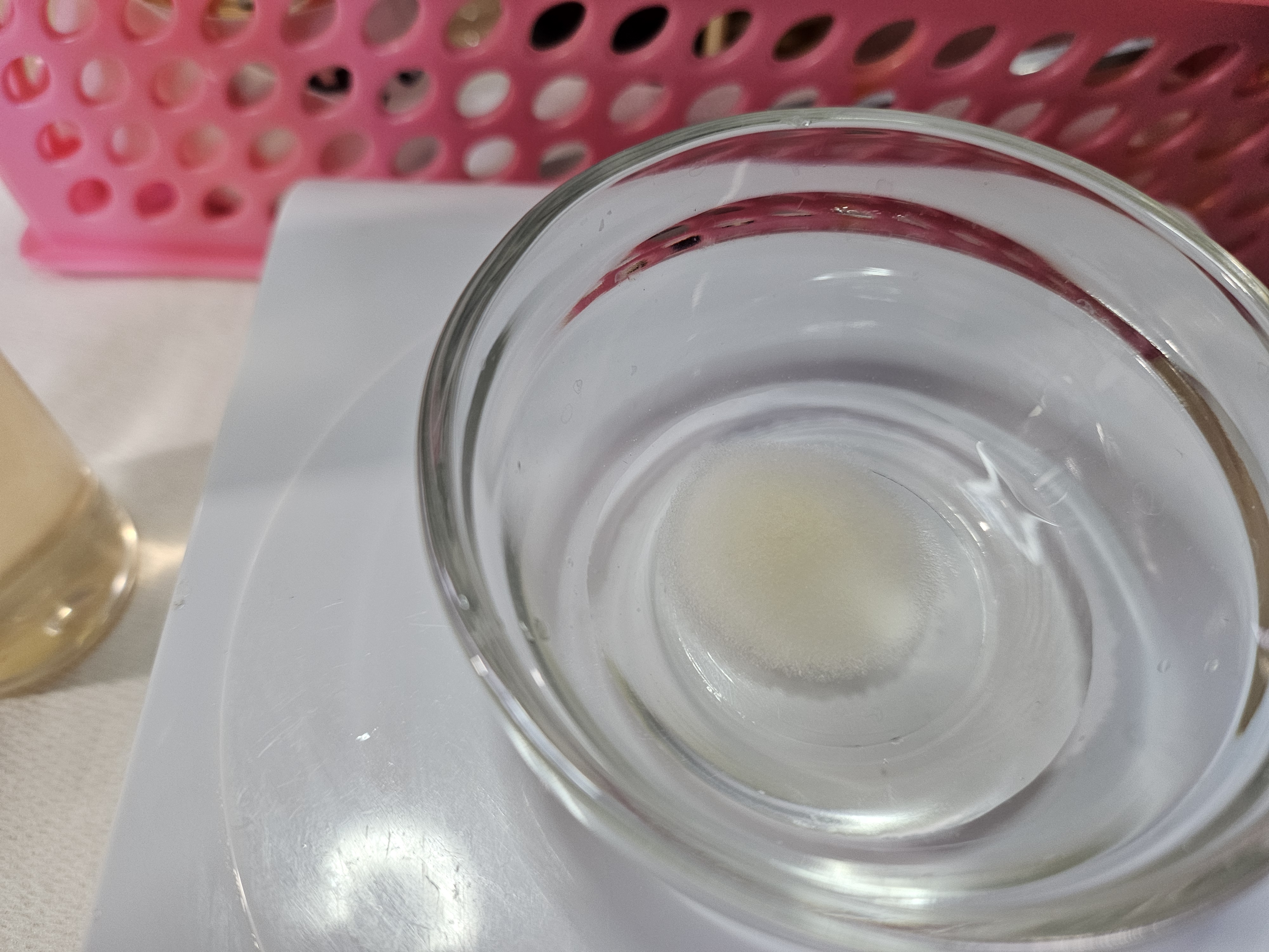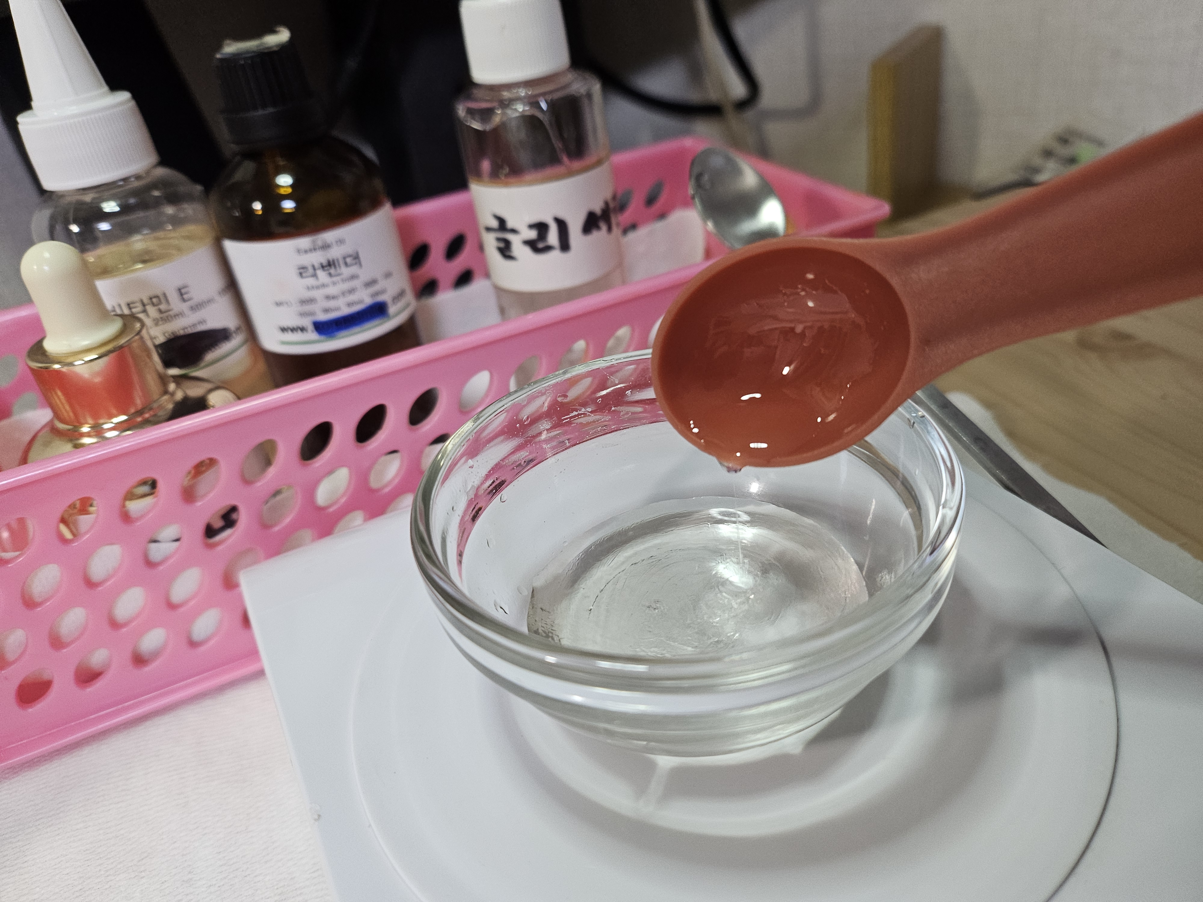 | 2. 글리세린 추가: 글리세린을 추가하고 혼합물이 잘 섞이도록 저어주세요. | 3. 비타민 E 오일 추가: 비타민 E 오일을 추가하고 다시 잘 섞어주세요.(오일은 혼합이 안되요, 솔루빌라이져 약간 추가) |